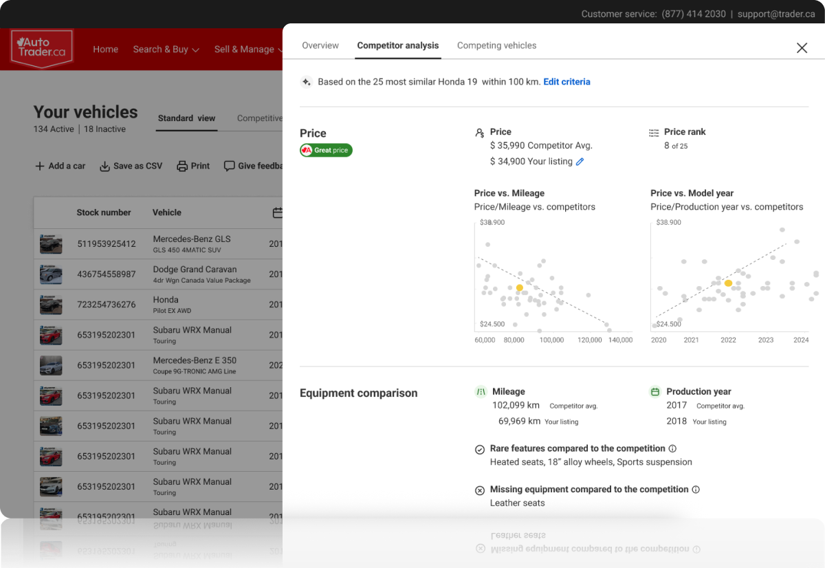 Stay ahead of the market with line of sight into competitor listings and prices to differentiate your advertised inventory across multiple dimensions. Dashboard’s AI-powered insights do the heavy lifting so you can make confident decisions without added complexity.